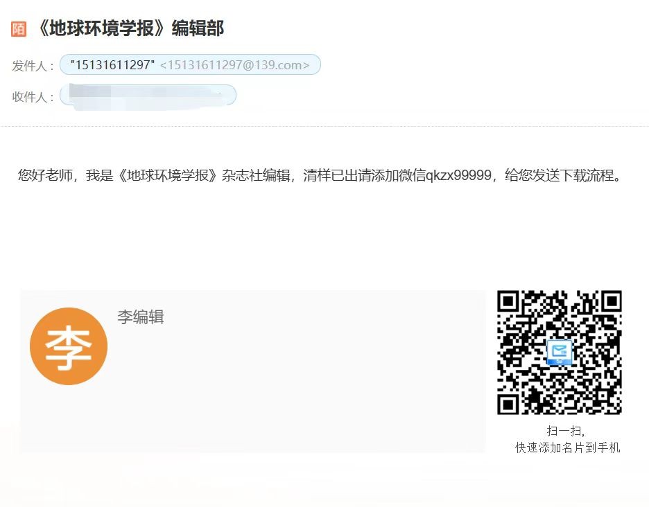 近日有作者反馈,收到假冒《地球环境学报》编辑部发送的 E-mail,内容为邀请作者添加微信获取文章清样,示例如下: